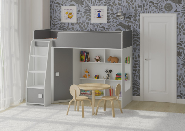 Внизу располагается игровая зона с полками – свой уголок для ребенка.